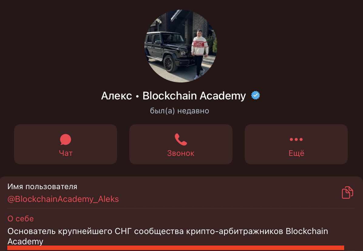 Главная онлайн-платформа проекта — телеграм канал Blockchainacademy Aleks. Его автор, известный как Алексей Полыгин, вряд ли озвучивает свое реальное имя. Лица он не скрывает, но и подробностей о пути в трейдинге не рассказывает. Аудитории его сообщества он вовсю вещает о том, что обладает невероятным опытом в успешном трейдинге и специализируется на схемах со связками P2P.