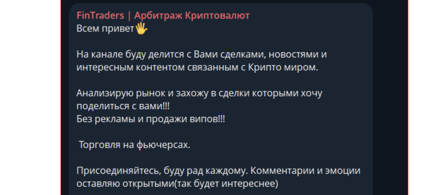 Полыгин начинал свою деятельность с публикации на канале «сверхприбыльных» сигналов и эксперт по криптовалютному трейдингу. Летом 2024 года он немного сместил акценту в сторону коучинга и начал продвигать себя в роли «гуру криптоарбитража». Профиль сообщества Fintraders — арбитраж криптовалют и стратегии, направленные на раскрутку депозитов. На его канале появились обучающие посты, а также бесплатные материалы для новичков трейдинга. Разумеется, в сообществе аудиторию интенсивно прогревали перед приглашением в «закрытый чат» с платным доступом.