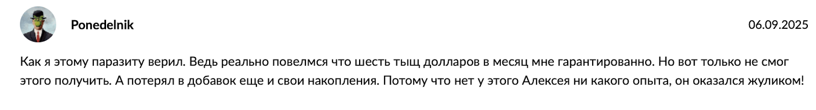 Предлагаемые Полыгиным схемы не выдерживают никакой критики. Опытные трейдеры не рекомендуют подходить к сообществу Алексея даже на пушечный выстрел. Условия, озвучиваемые скамером, не соответствуют реалиям финансовых рынков и криптоарбитражу в целом.