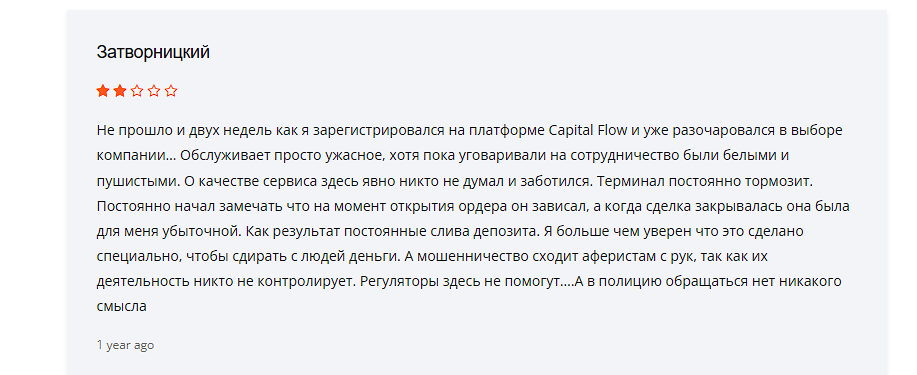 Поиск клиентских откликов помог разгадать тайну молодого домена. Судя по сторонним обзорам, ранее брокер базировался по адресам capital-flow com и capital-flow io, которые уже не работают. И об этих прежних версиях в интернете есть много негативных отзывов, вплоть до обвинений в мошенничестве.