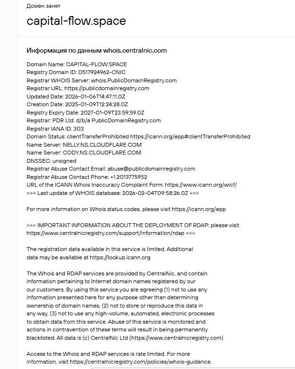 Кто скрывается за доменом capital-flow.space, неизвестно. Эти данные скрыты: имя, адрес и телефон владельца. Контакты указаны только для регистратора PublicDomainRegistry.