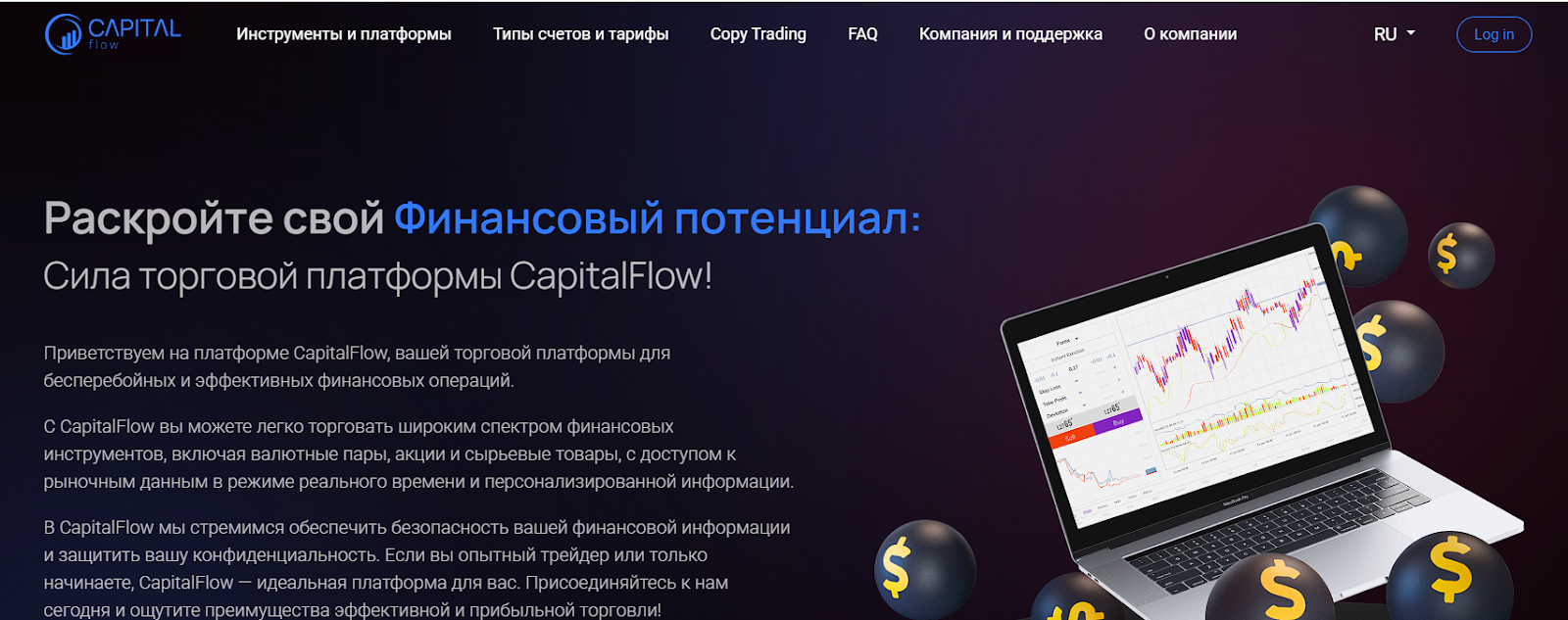 Capitalflow – это торговая платформа для работы с различными активами. Она предлагает несколько тарифов, современный функционал и усиленную защиту. Клиентам доступны сегрегированные счета, аналитические инструменты, копи-трейдинг и другие бонусы.