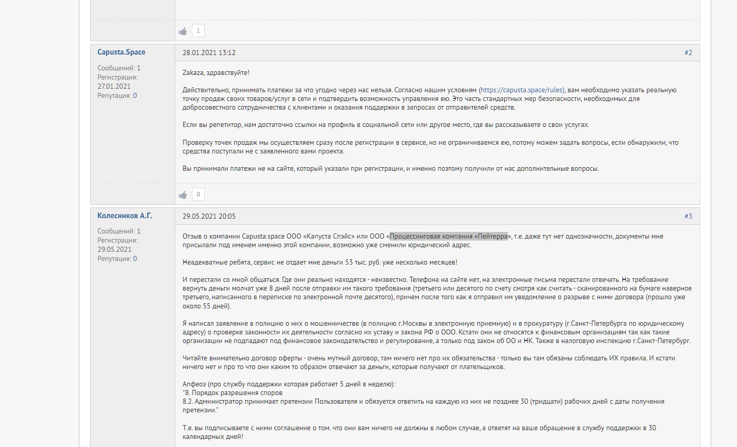 Потом сервис просто прекратил свое существование, администраторы сообщили про закрытие в социальных сетях в октябре 2022 года. Но сайт платформы продолжал работать и принимать платежи. В итоге в 2023 году появились про сервис Capusta Space отзывы, что на сайте «зависли» платежи, которые невозможно вывести.