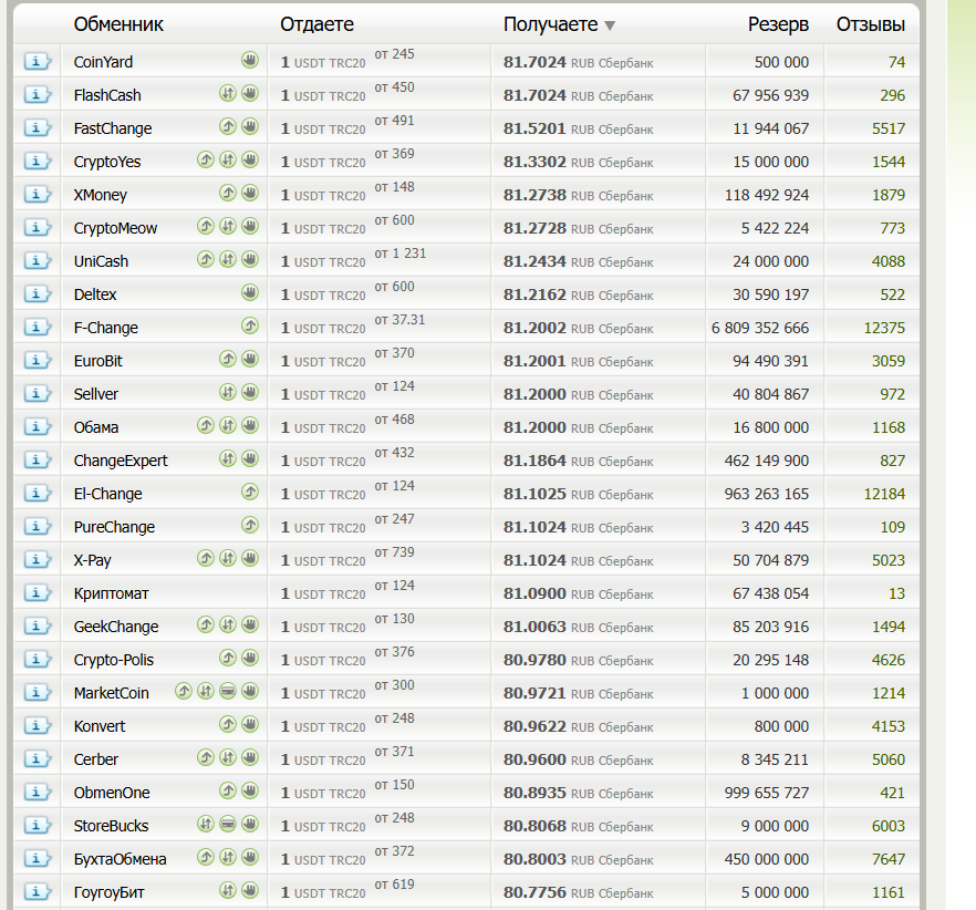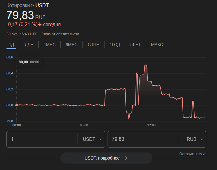 Обменник «Кашалот» поддерживает несколько направлений работы, в том числе вывод криптовалюты переводом на карту. Размер минимальной транзакции ограничен суммой в ₽15,000, а за 1 USDT клиент может получить ₽80.1.На момент подготовки обзора в Google предлагают курс в ₽79,8, что является менее выгодной котировкой и немного снижает профит от обмена. Показатели в поисковике могут использоваться лишь для ознакомления и не являются реальным рыночным предложением, поэтому мы продолжили анализ.