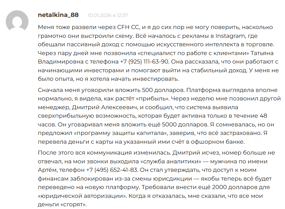 Помимо этого, представители кошелька требовали других пополнений, чтобы разблокировать счет, но средства все равно никто не получал. Так как в сети полностью отсутствуют положительные отзывы о Cfh cc, заявления пользователей о разводе похожи на правду, а это значит, что репутация у проекта крайне негативная.