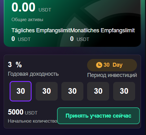 Пополнить кошелек можно от 10 USDT, а также доступно инвестирование с доходом до 20% годовых, но для этого нужно внести минимальный депозит $5,000.
