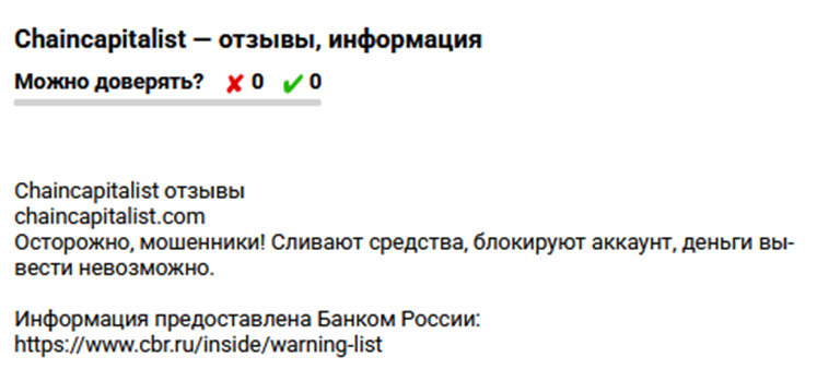 ЧейнКапиталист Ком – брокер, предлагающий услуги торгового терминала и инвестиционной площадки. О компании практически ничего не известно, кроме наличия регистрации в США. Указано, что она также имеет договора с регуляторами, лицензирована в РФ. Но документальных подтверждений этому не обнаружено. Также ничего неизвестно о команде брокера, ведущих сотрудниках и аналитиках.