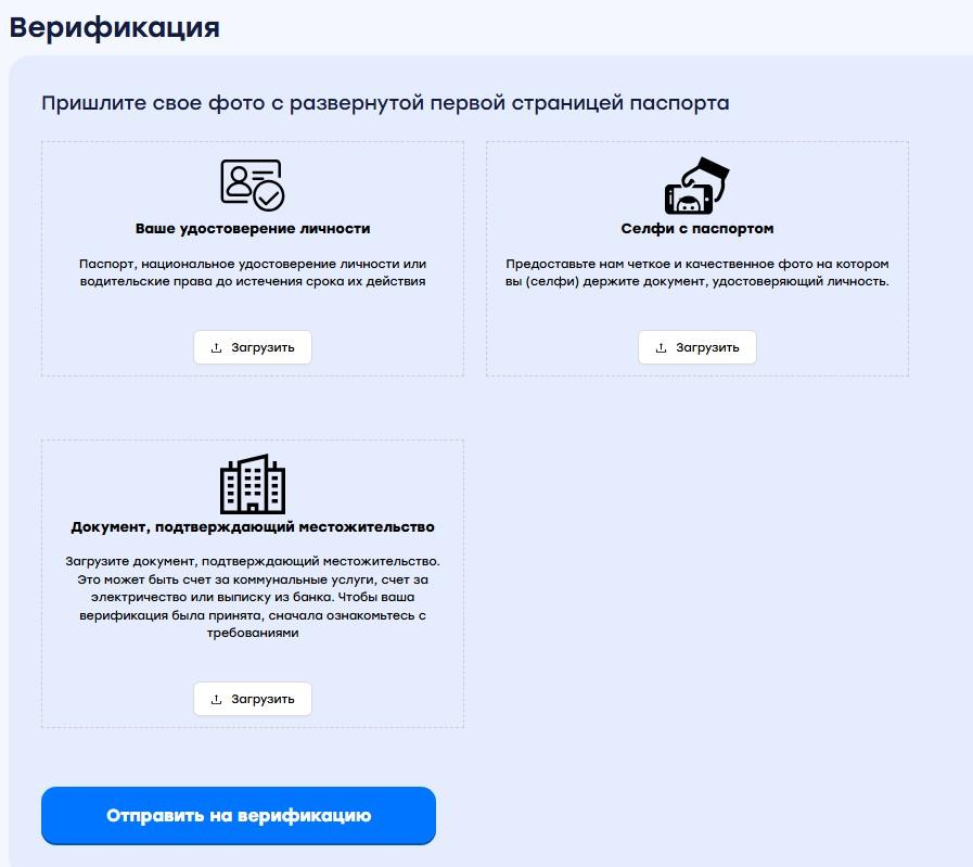 Возможно, чтобы опция пополнения счета стала активной, нужно пройти верификацию личности. Такой пункт есть в разделе «Профиль». Необходимо загрузить фото паспорта, селфи с паспортом и документ, который подтверждает место жительства.