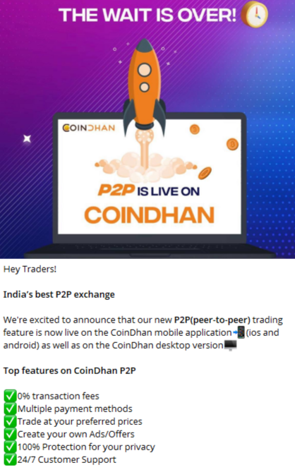 К сожалению, не удалось найти информацию относительно дизайна официальной страницы проекта, ее владельцев и имеющихся разрешений на ведение финансовой деятельности. Однако у компании есть информационная страница в Телеграмм, где можно ознакомиться с новостями организации. Она находится по адресу @ CoinDhan Announcements.Основной упор в ленте сообщества идет на новый функционал площадки — P2P-обмен активов. Он доступен не только в десктопной версии ,bh;b, но и через мобильное приложение. Разработчики отмечают важные преимущества своего предложения: