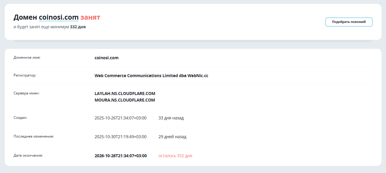 Домен coinosi com зарегистрировали в октябре 2025 года, он существует немногим больше месяца – это лишь подтверждает опасения о возможном скаме. Соответственно, о владельцах адреса нет никакой информации, что только усиливает подозрения.