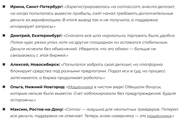 • В отзывах о support coinosi com утверждается, что поддержка не отвечает на запросы, а клиенты потеряли деньги на этой бирже – это говорит о прецедентах обмана.