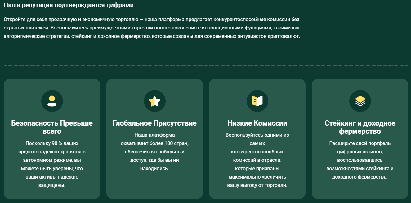 Разработчики платформы заявляют, что одно из её главных преимуществ — надёжная защита средств. На сайте утверждается, что 98% всех активов хранятся в автономном «холодном» хранилище. Ключевым плюсом называются конкурентные низкие комиссии, которые призваны максимизировать прибыльность торговли клиента.