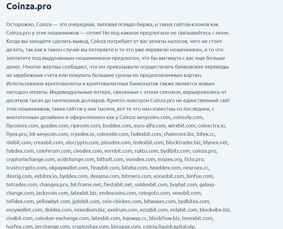 В интернете есть серьёзное предупреждение о платформе Coinza Pro. В нём говорится, что это мошеннический проект, у которого существует множество сайтов-клонов, таких как coinsoly com, flycoinex com, gusdex com и других. Автор этого предупреждения настоятельно советует не иметь дел с данной платформой.