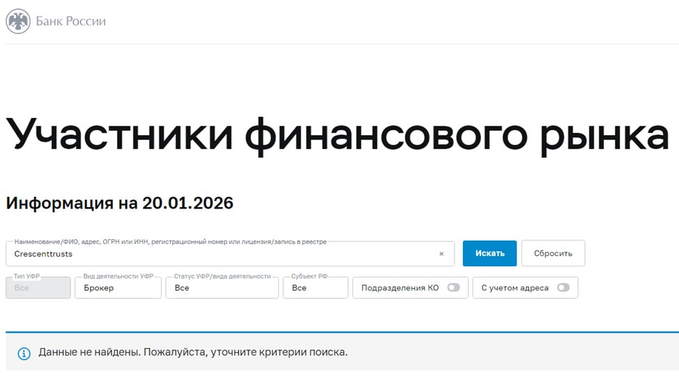 Crescent Trustee Gmbh как брокер обязан иметь лицензию Центрального банка РФ. Но в реестре такой организации не числится. Это значит, что платформа реально является опасной и не регулируется правоохранительными органами. Это негативный факт, так как брокер подвергает своих клиентов проблемам. Трейдеры, которые пользовались его услугами, могут считаться соучастниками нарушения закона. А информация, которую они предоставляют, и деньги могут быть украдены.