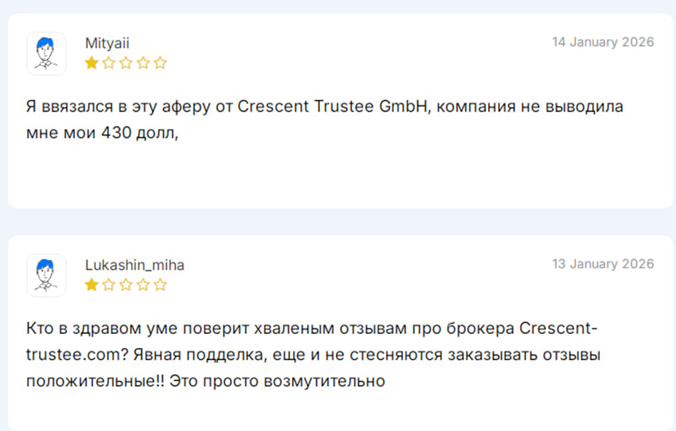 Отзывы о Crescent Trustee Gmbh немногочисленные, потому что платформа новая. Но все они негативные, а это значит, что кто-то уже попался в ловушку мошенника. Пользователи рассказывают, что компания не выводит деньги. У одного клиента так застряли 430 долларов, которые так и не вернули. В итоге, аккаунт заблокировали и прибыль исчезла. Многие инвесторы утверждают, что некоторые положительные отзывы в Интернете заказаны и верить им не стоит. Скорее всего, так и есть.