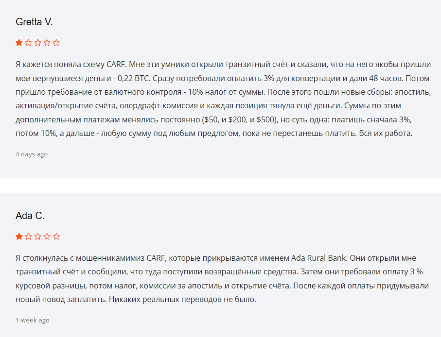 В интернете размещены негативные отзывы о Ca Rf Us. Один из клиентов описывает ситуацию, в которой представители проекта связались с автором от имени юристов. Они сообщили о нахождении средств в банке Ada Rural Bank. После этого потребовали оплату заградительного тарифа и налогов. После первой транзакции начали запрашивать дополнительные платежи под разными предлогами.