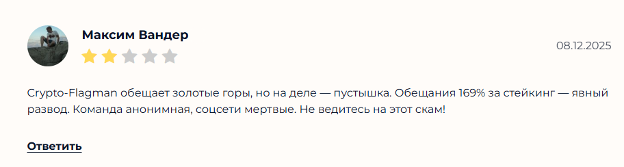 На независимых площадках и профильных форумах отзывов довольных клиентов о Btc Flagman почти нет. Для человека, который декларирует многолетний опыт и работает с учениками, такое отсутствие репутации выглядит неестественно. Обычно у практикующих трейдеров со стажем хотя бы часть аудитории делится впечатлениями, описывает результаты обучения или совместной торговли. При этом, те отзывы, что удалось найти, негативные. Пользователи указывают на невыполнимые обещания и обвиняют «Крипто Флагман Bitcoin» в мошенничестве.