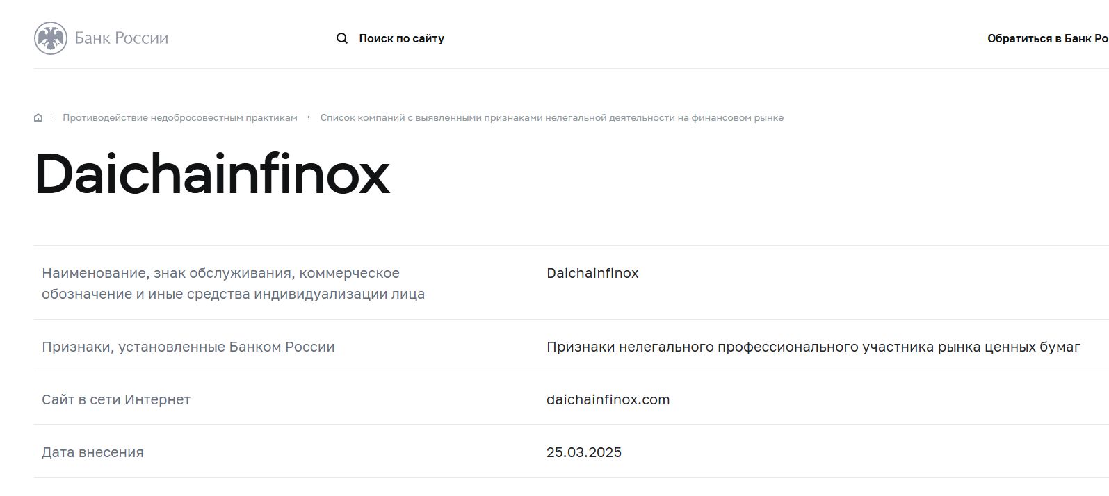 Несмотря на заявления о защите средств клиентов, Daicha Infinox не дает никаких гарантий. Кроме того, Центробанк России полностью запретил работу Daicha Infinox 25 марта 2025 года, включив эту компанию в черный список.