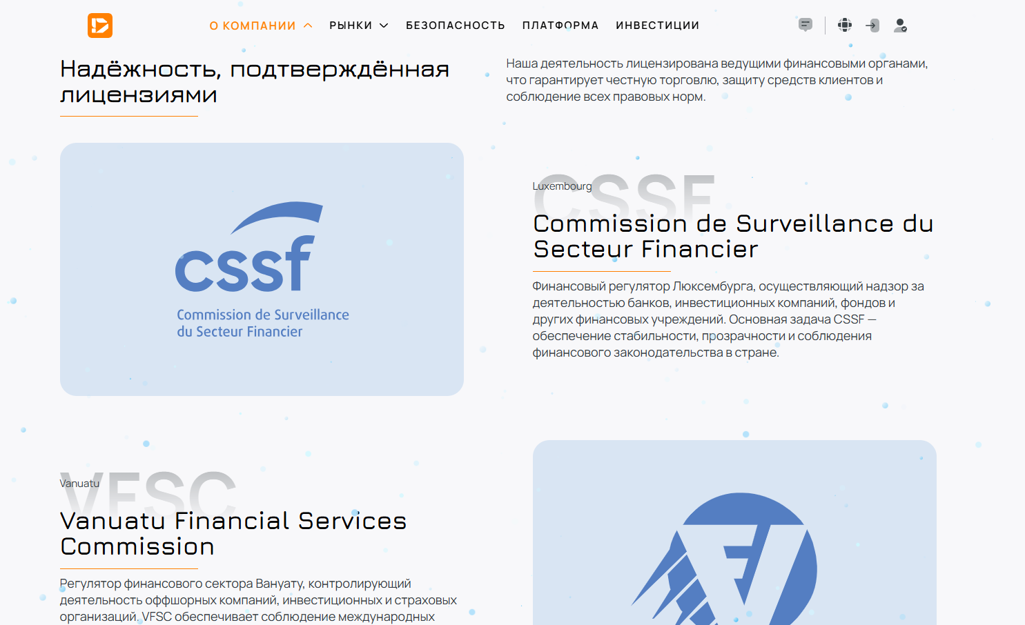 Основной сайт выглядит стандартно, есть упоминания регуляторов FCA, DFSA, CSSF, VFSC, обещания сегрегации средств, круглосуточной поддержки и защиты инвестиций.