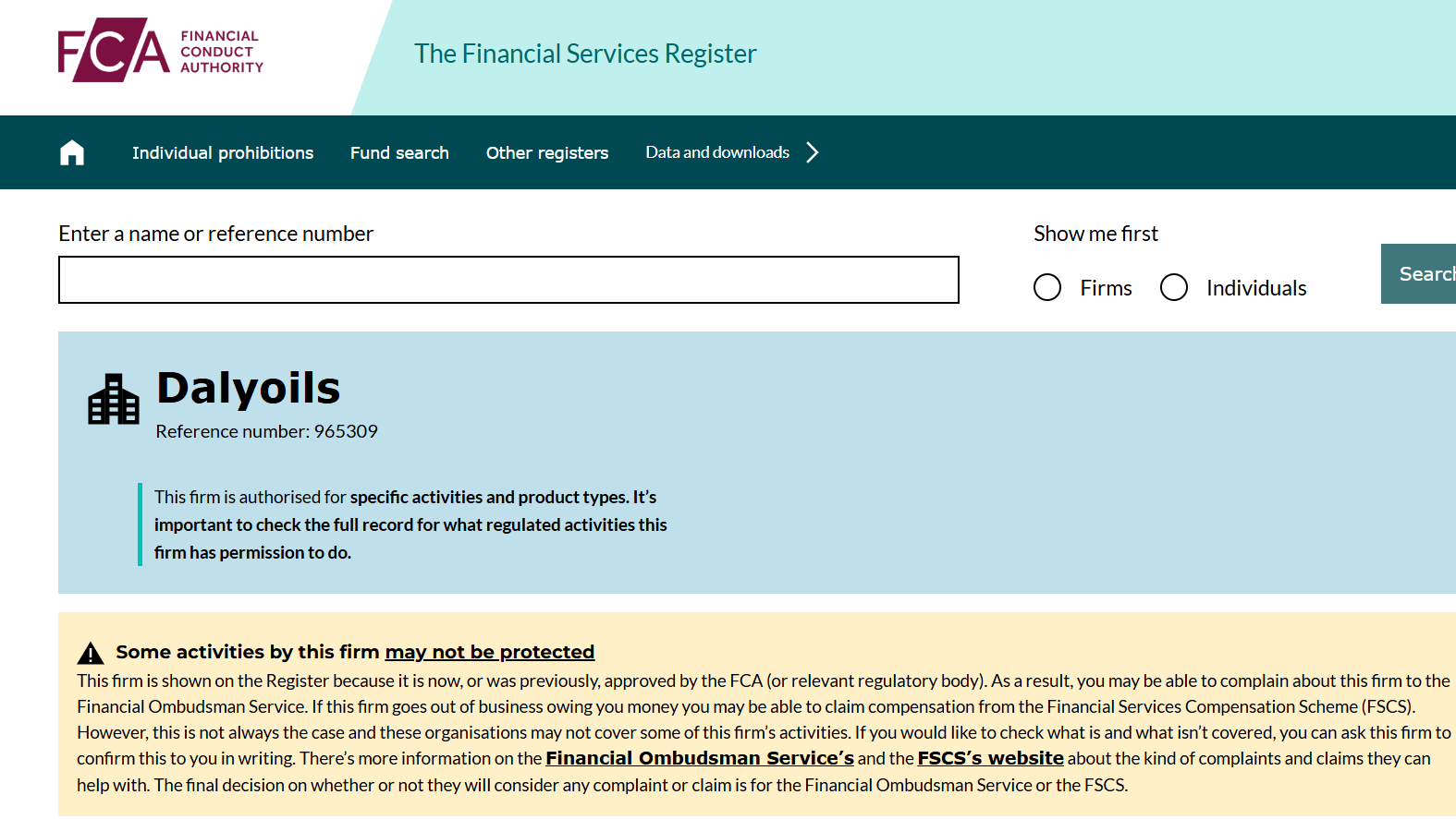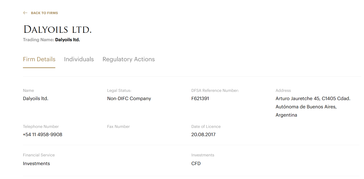 В DFSA Dalyoils брокер указан как Non-DIFC Company, то есть он не имеет полноценной лицензии для оказания услуг в Дубайском международном финансовом центре.