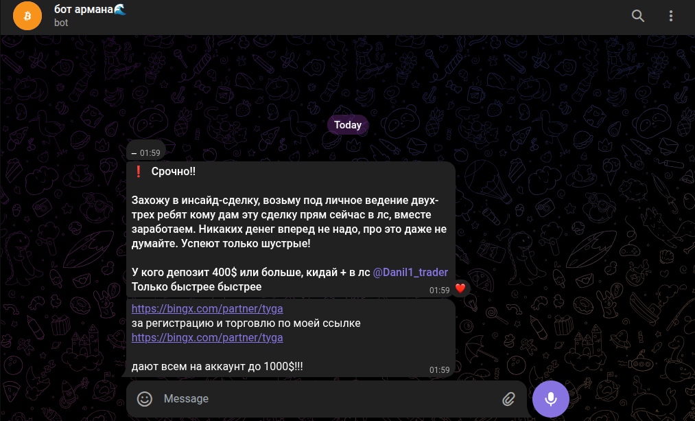 Как видно на скриншоте выше, эксперт еще берет подписчиков на личное ведение при депозите от 400 долларов. Весь телеграм-канал Даниила Криптана в целом пропитан бесплатными прогнозами, непонятными скриншотами. Однако, автор сообщества не забывает о монетизации проекта, активно размещая рекламу. Последний такой пост был за 29 декабря 2025 года, где Даниил рассказывает про инсайдера Богдана, который якобы гарантированно помогает заработать деньги на крипте.