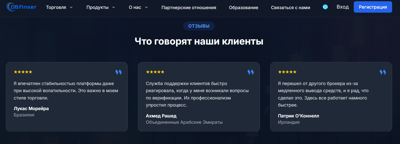 На сайте DBFinser com отзывы публикуются в отдельном блоке и все они от довольных трейдеров. Они хвалят службу поддержки, надежную стабильность обслуживания и быстроту любых операций в терминале.