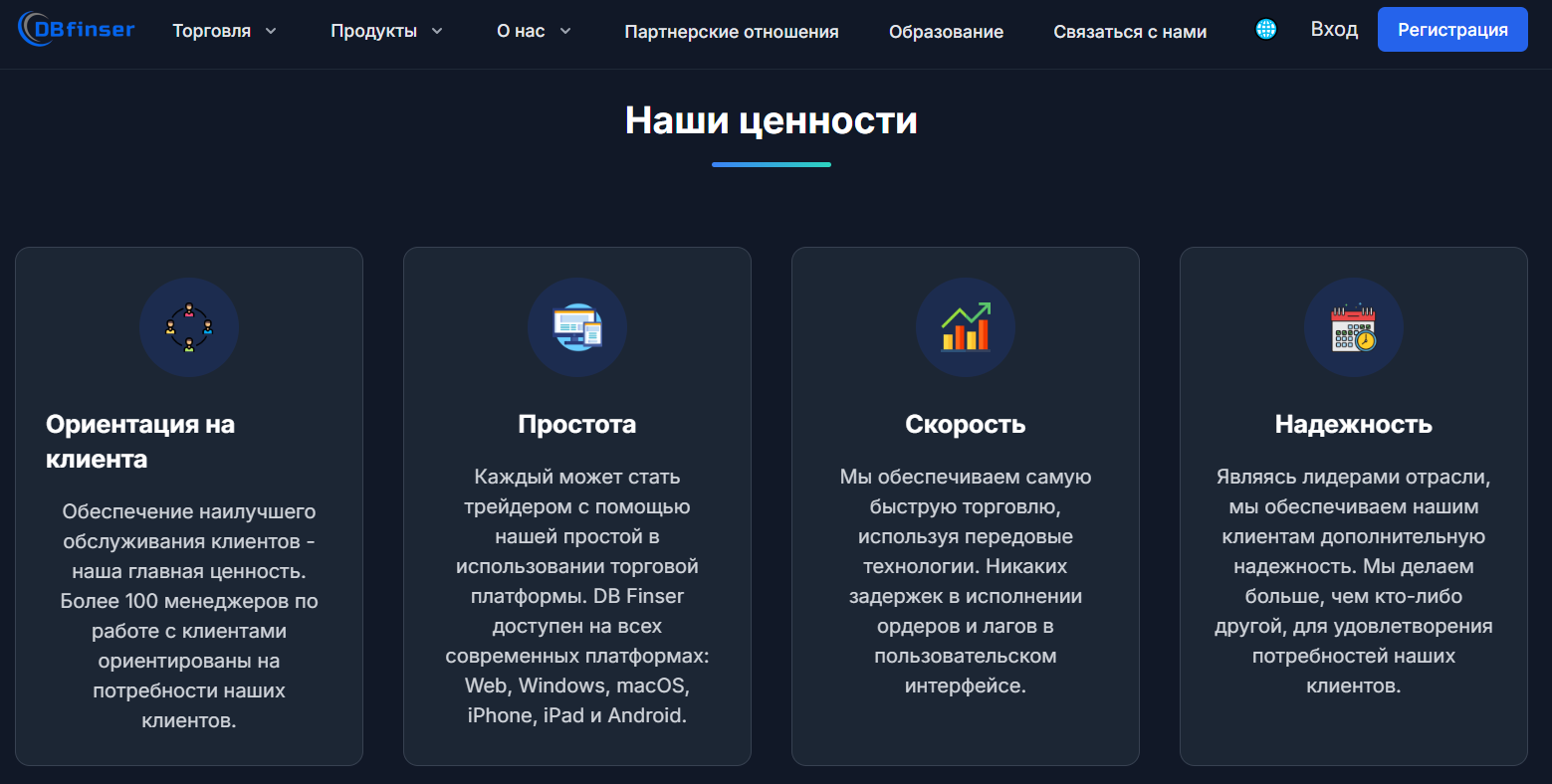Информация о самой компании на платформе описана обобщенно. Там говорится, что брокер опытный, имеет награды и многоязычную поддержку через почту support@dbfinser com. Акцент же делается на ценностях проекта, куда входят клиентоориентированность, простота, скорость, надежность. Чем подкреплено все это, не уточняется.