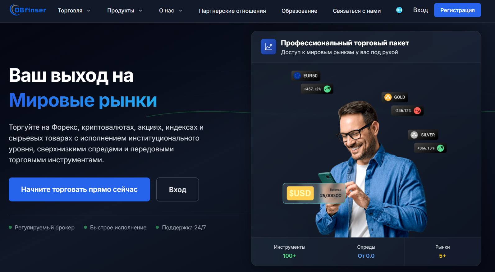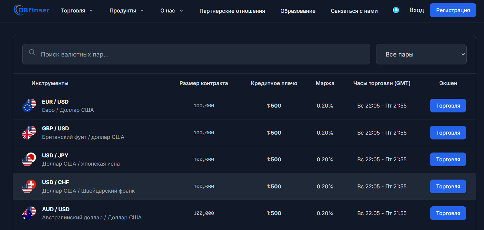DBFinser – это онлайн-брокер, на площадке которого предлагается выход на мировые финансовые рынки. Для торговли здесь, по заявлениям разработчиков, доступны современные инструменты и действуют лояльные клиентские условия с низкими спредами, мгновенным исполнением сделок, круглосуточной техподдержкой и возможностью автоматизации работы.