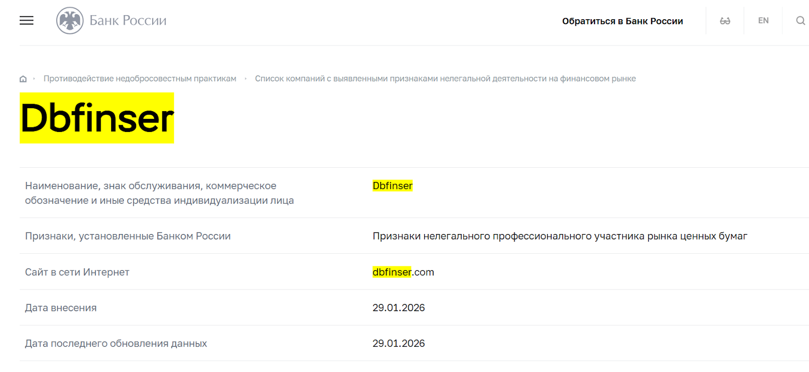 Конкретики о том, как устроена архитектура безопасности на платформе DBFinser com не сказано. Зато практически в каждом разделе упоминается о некой надежности и инновационности. Из регуляции упоминается лишь ирландский Центробанк и лицензия от ASIC. Тем не менее на сайте ЦБ РФ данный брокер внесен в список нелегальных организаций.