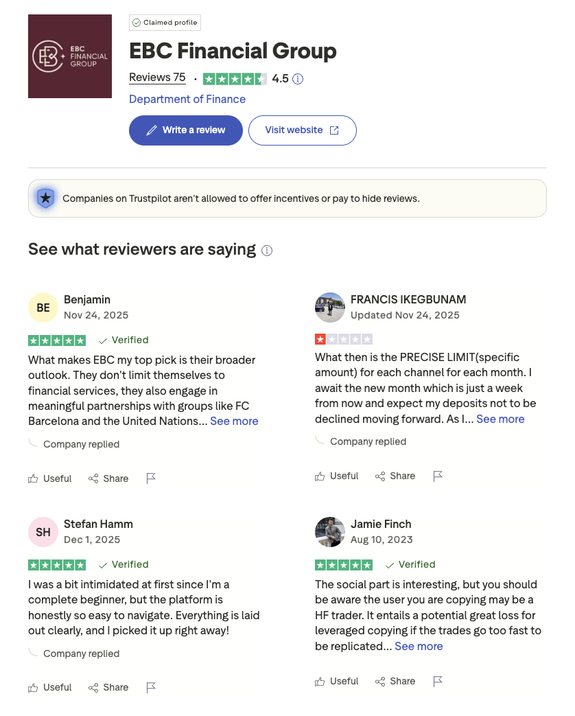 О брокере EBC Financial Group отзывы преимущественно позитивные. Наша редакция проанализировала этот фидбэк, а также изучила ключевые особенности платформы. В результате мы выяснили, действительно ли можно доверять обслуживание счета владельцам данной площадки.
