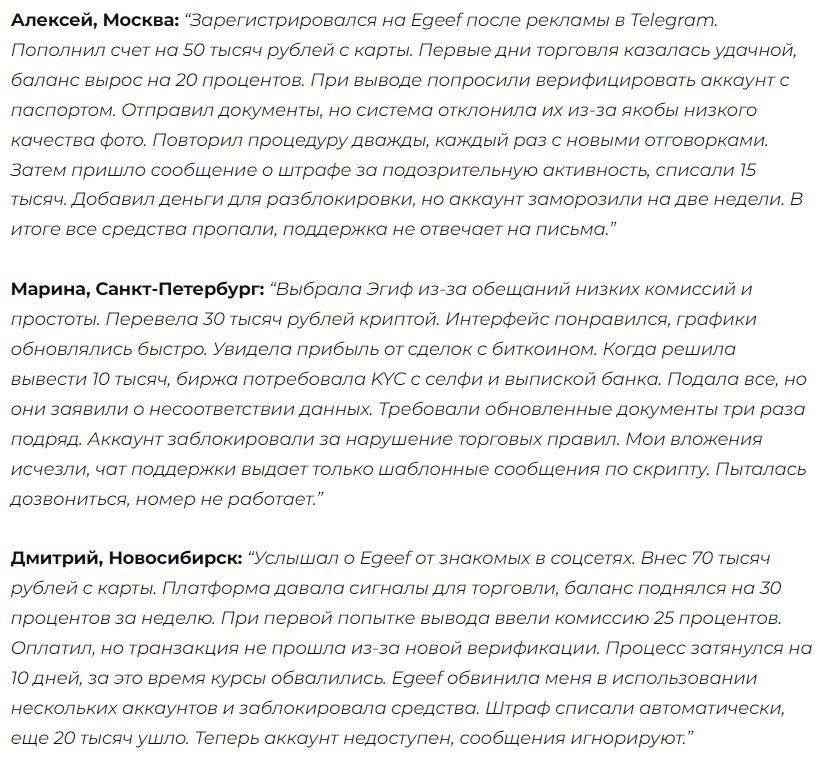 Но розовые очки лопаются при попытке выводить money из сервиса. Специалисты поддержки вдруг меняют лояльное отношение к трейдерам на полное игнорирование либо на агрессивную политику. Людям угрожают блокировкой профиля. Для вывода средств требуются успешные прохождения бесконечного количества платных верификаций личности. Постоянно выманивание кэша у граждан способствует произведению негативного впечатления публики о платформе. Участие в проекте Egeef не сулит ничего хорошего. Финансовые потери и убытки – единственный результат, на который выходят трейдеры в этой скам системе.