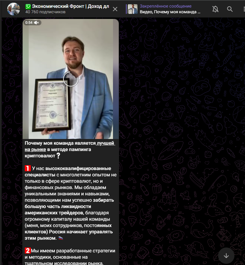 В единственном на октябрь 2025 года закреплённом посте основатель «Экономический Фронт | Доход для наших» рассказывает, почему его команда по трейдингу является якобы лучшей на рынке в методе пампинга криптовалют: