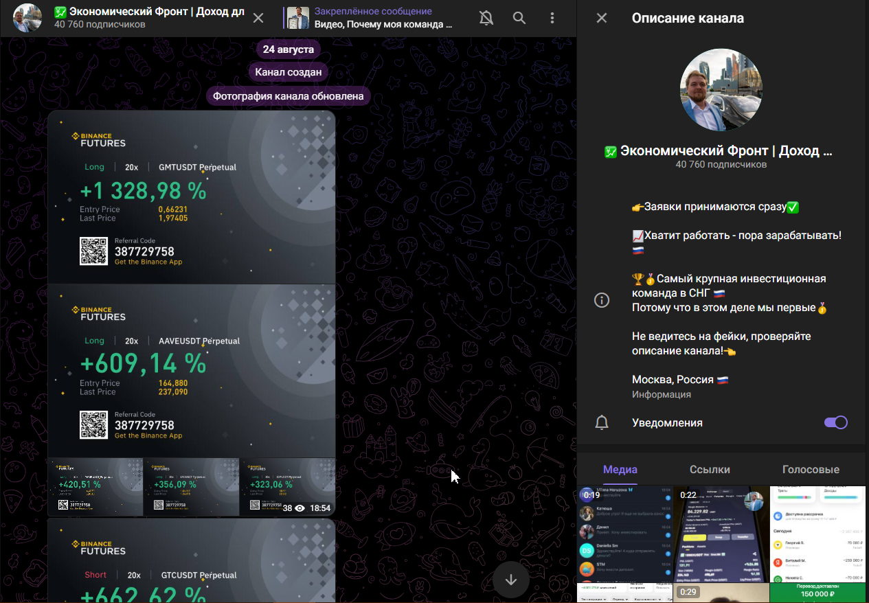 Финансовый проект в Телеграмм «Экономический Фронт | Доход для наших» создал некий Михаил. Он утверждает, что является лидером успешной команды по трейдингу. Его телеграмм-канал является закрытым, но заявки на присоединение одобряются моментально. В обзоре проанализируем, как предлагает зарабатывать Михаил, и что о нём говорят настоящие клиенты.