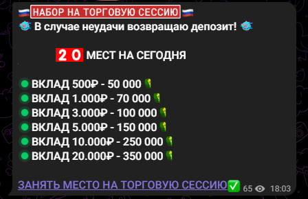 Торговые сессии на телеграмм-канале проводятся регулярно. На 15.10.2025 крайний набор был в тот же день. «Экономический Фронт | Доход для наших» даёт 100% гарантию результата, а в случае отрицательного профита обещает вернуть депозиты. Условия сотрудничества описаны максимально сжато, уточняются только размеры вкладов и ожидаемая прибыль: