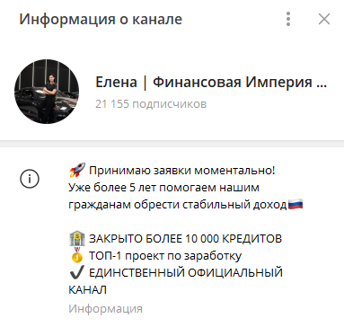 «Елена | Финансовая империя ru» – это телеграмм-канал трейдера, который готов покупать и продавать токены в плюс для клиентов. В Интернете мы собрали материал, чтобы поделиться с вами фактами о финансовом проекте.
