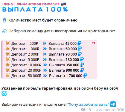 - в тгк «Елена | Финансовая империя» обещают нереалистичную доходность, ничем не подкрепленную;