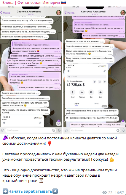 Дополнительно подписчикам показывают коллажи общения между трейдерами и инвесторами. Это также, вероятно, направлено на бесплатное повышение уровня доверия среди аудитории.