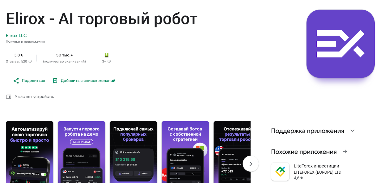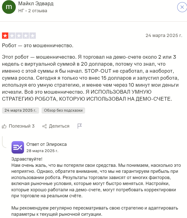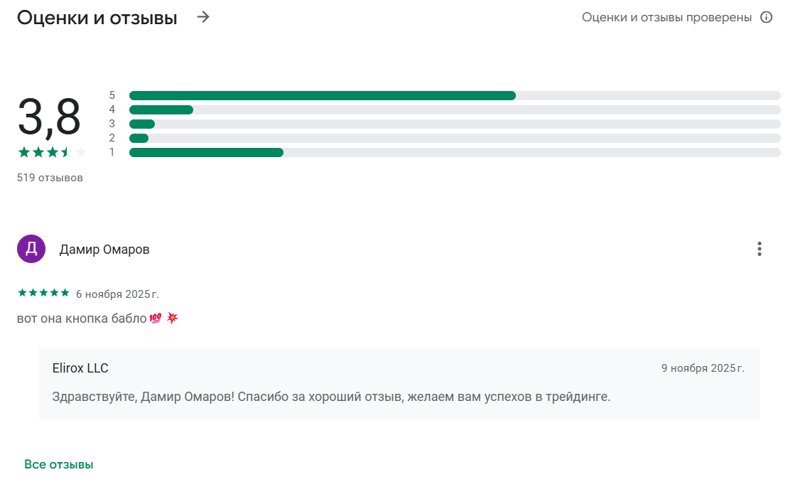 В магазине Google Play приложение «Elirox AI – торговый робот» имеет оценку 3.8 на основе 519 отзывов. Тем не менее текстовый фидбэк только один: пользователь емко похвалил приложение. Настораживает большое количество оценок «единица» при еще большем количестве «пяти звезд».