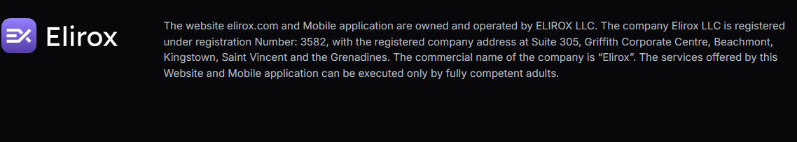 Компания зарегистрирована как Elirox LLC под регистрационным номером 3582 в юрисдикции государства Сент-Винсент и Гренадины. Это офшорная зона, регистрация в которой скорее является формальной и не подразумевает строго регулирования. Гораздо важнее, имеет ли компания лицензии от крупных финансовых регуляторов, наподобие FCA, и публично об этом ничего не сказано.