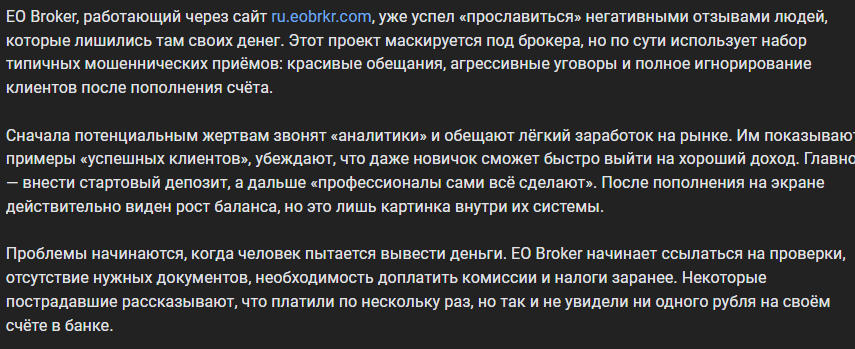 - В отзывах о Ru EoBrkr com пользователи пишут про развод из-за невозможности вывода средств, поэтому любые взаимодействия с площадкой считаются рискованными.