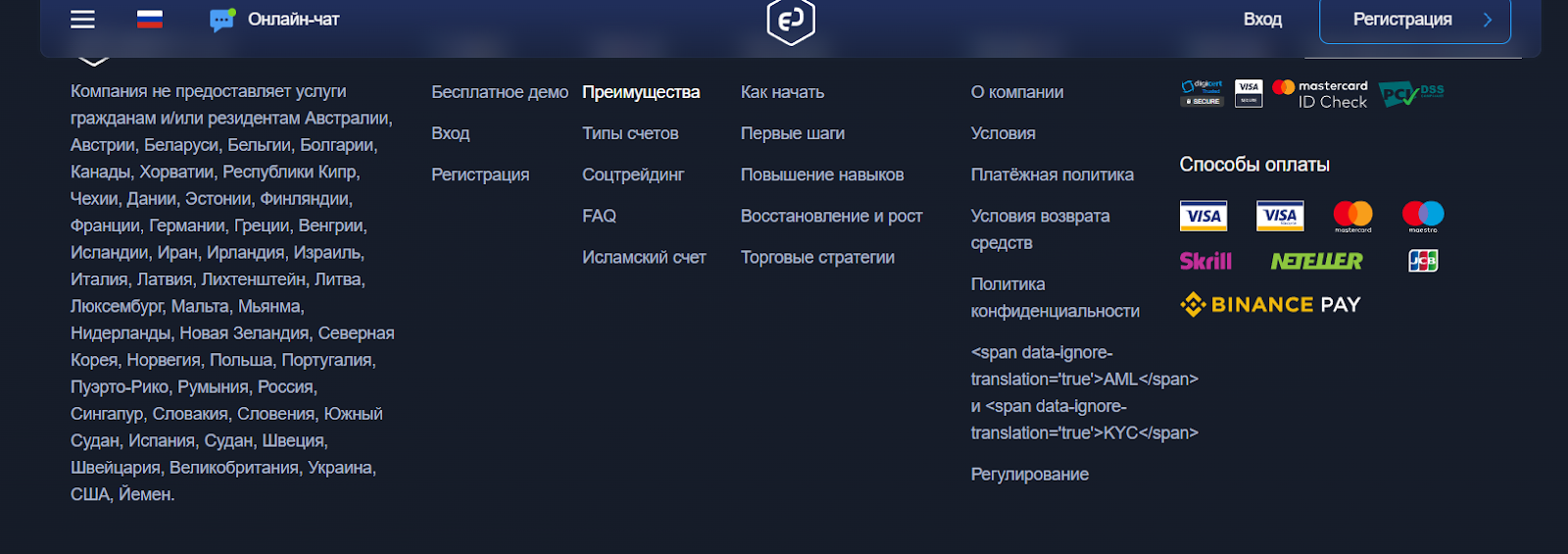 На сайте Ru EoBrkr com можно изучить список всех стран, гражданам которых запрещено пользоваться ресурсом, куда входит США, Украина, Беларусь, Великобритания и другие.
