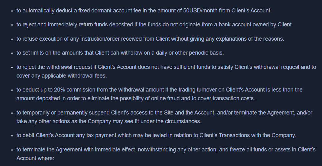 Более того, это не лицензия, а только сервис, который ничего не гарантирует, хотя все равно получается, что деятельность брокера никем не регулируется. В документах огромное количество красных флагов, например, компания может осуществить блокировку профиля без объяснения причин, забирать 20% от суммы депозита, если он меньше торгового оборота, отказать в исполнении ордеров.