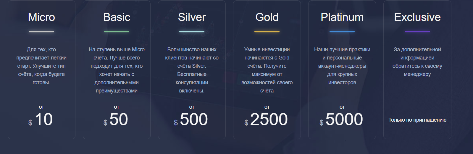 О комиссиях и доступных платежных инструментах на Ru EoBrkr com информации нет, зато представлено шесть типов валютных счетов, которые отличаются суммой внесения минимального депозита:
