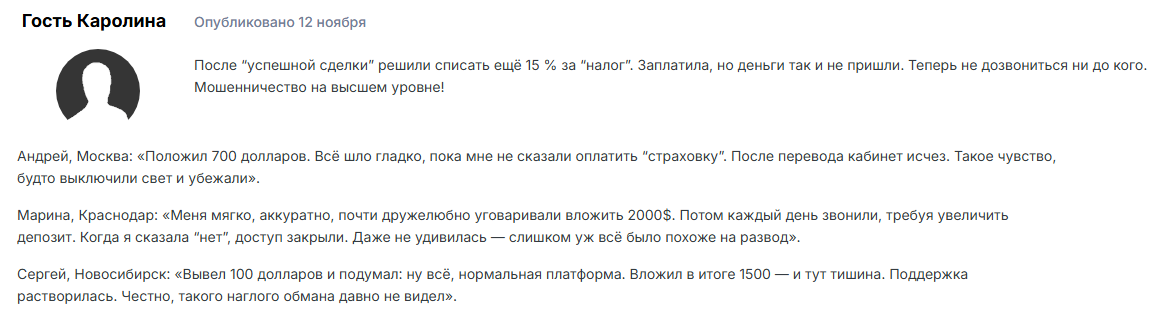 Представители фейкового брокера уговаривают юзеров пополнять депозит на максимально возможную сумму, после чего обрывают все коммуникационные каналы.