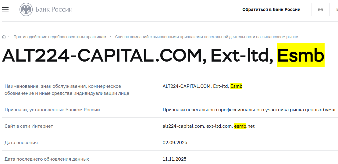 Скам-компания находится в списке нелегальных платформ. Из-за отсутствия регуляции этот сервис совершенно точно нельзя назвать надежным. На сайте размещены фальшивые данные о компании, фейковые отзывы и сведения о безопасности. На самом деле никаких подтверждающих положительную репутацию этого сервиса данных в сети нет. Сомнительная контора Esmb Net появилась на рынке в конце октября 2025 года и завоевать признание трейдеров она точно не могла успеть.
