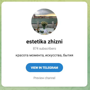Проект telegram «Эстетика Жизни» позиционирует себя как ресурс, посвященный гармонии во всех ее проявлениях. Судя по названию, контент может быть сосредоточен на вопросах стиля, искусства, дизайна и личностного развития. Такие каналы наглядно демонстрируют, что красота и порядок в окружающем пространстве сильно влияют на наше настроение и даже на доход. Это не просто красивые слова – психологи и философы давно подтвердили, что гармоничная обстановка делает жизнь лучше.