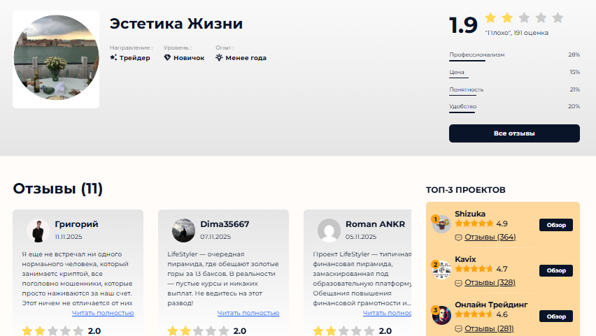 Мы нашли обзор на одной площадке в сети, на котором указан логотип и адрес Тгк Estetika Zhizni. Между тем в тексте речь идет явно о другом ресурсе. А в отзывах указывается вообще сторонний проект LifeStyler.