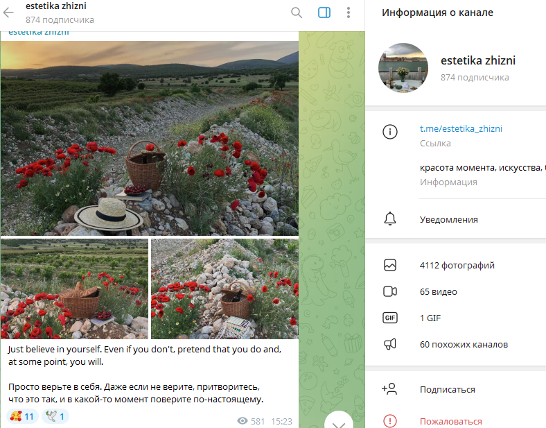 Как и многие ресурсы в Telegram, канал Estetika Zhizni вероятно делает акцент на визуально привлекательном контенте. Который легко потребляется и создает у подписчика ощущение причастности к «прекрасному». Такой подход косвенно подтверждается мнением экспертов, которые отмечают, что эстетика жизни действительно способна снижать тревожность и активизировать центры удовольствия в мозге.