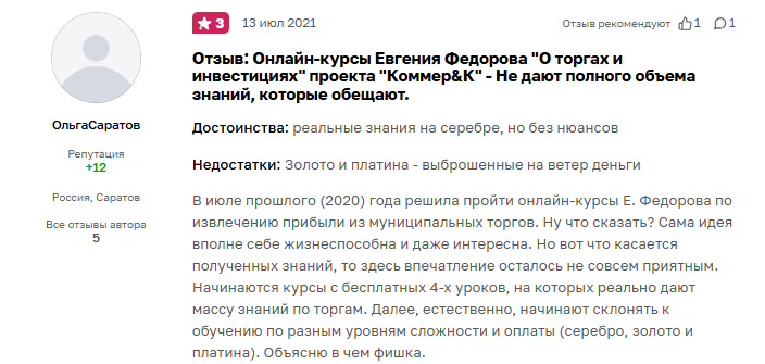 Автор негативного отзыва критикует тарифы инвестора. «Серебро» якобы дает знания, но только поверхностные, а «Золото» и «Платина» – в принципе «выброшенные на ветер деньги». В целом, отзыв о деятельности Евгения Федорова носит негативный характер.