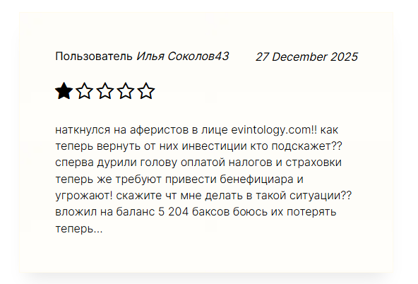 Отзывы об Evintology в основном отрицательные. Это видно по рассказам пользователей на профильных площадках и в комментариях. Чаще всего жалуются на вывод средств. Заявки висят «в обработке», сроки сдвигают, деньги не поступают. Параллельно некоторым предлагают снова пополнить счет «для ускорения» или «для верификации». Со службой поддержки тоже проблемы. Обращения игнорируют или отвечают шаблонно и с большой задержкой. Быстрых решений нет.